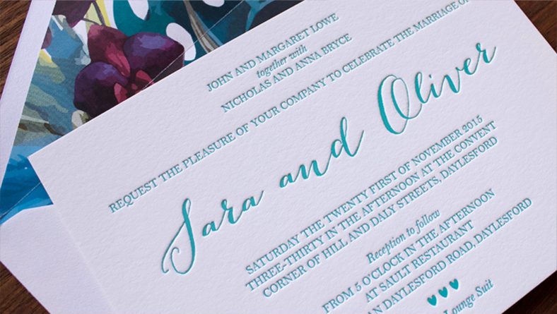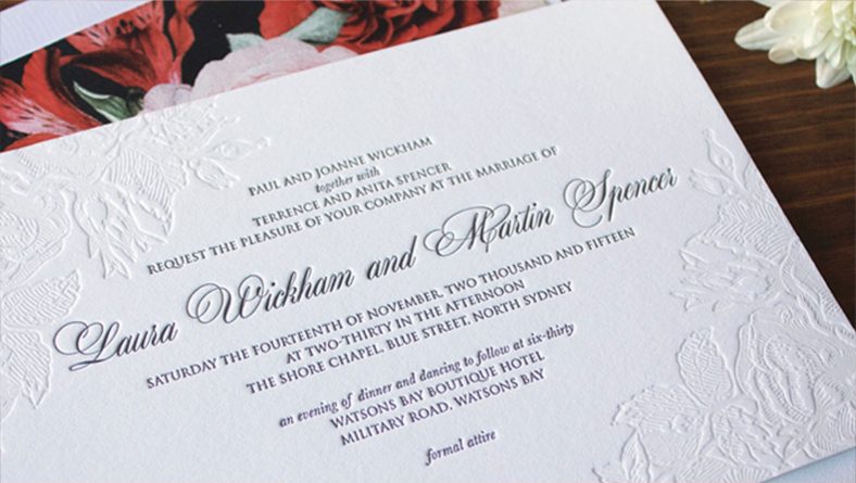 Letterprpressul realizeaza cele mai fine detalii presate in carton pentru a obtine o invitatie de nunta simpla si de clasa.
