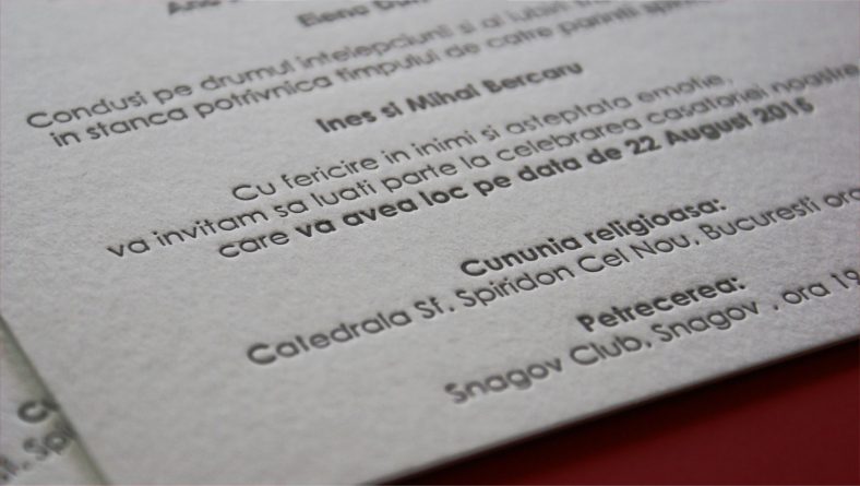 Folosit pe cartoane premium albe sau colorate de la 400 g/mp in sus – letterpressul presupune presearea textului in carton aplicand in acelasi timp culoare.